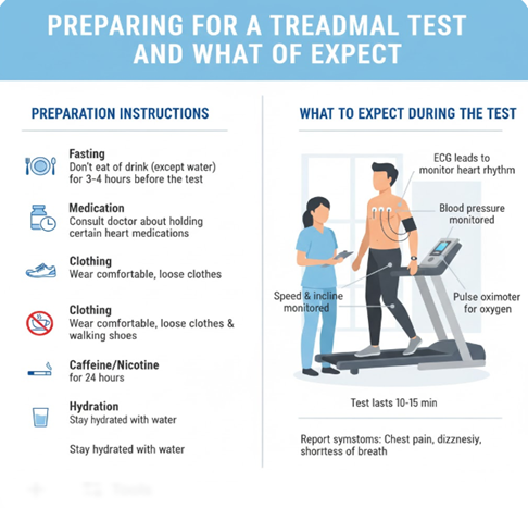 Proper preparation helps ensure accurate treadmill test results and a smooth testing experience. Patients are generally advised to wear comfortable clothing and sports shoes suitable for walking or jogging. Heavy meals should be avoided at least two to three hours before the test, as digestion can affect heart rate and comfort during exercise.